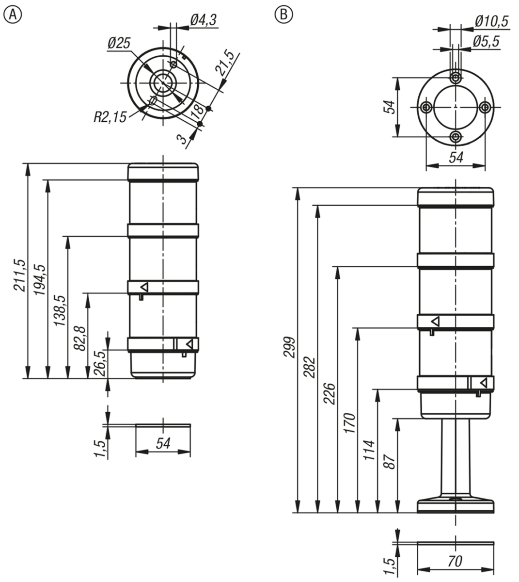 Colonnes de signalisation, LED verte, jaune, rouge, Ø70 mm appareil complet