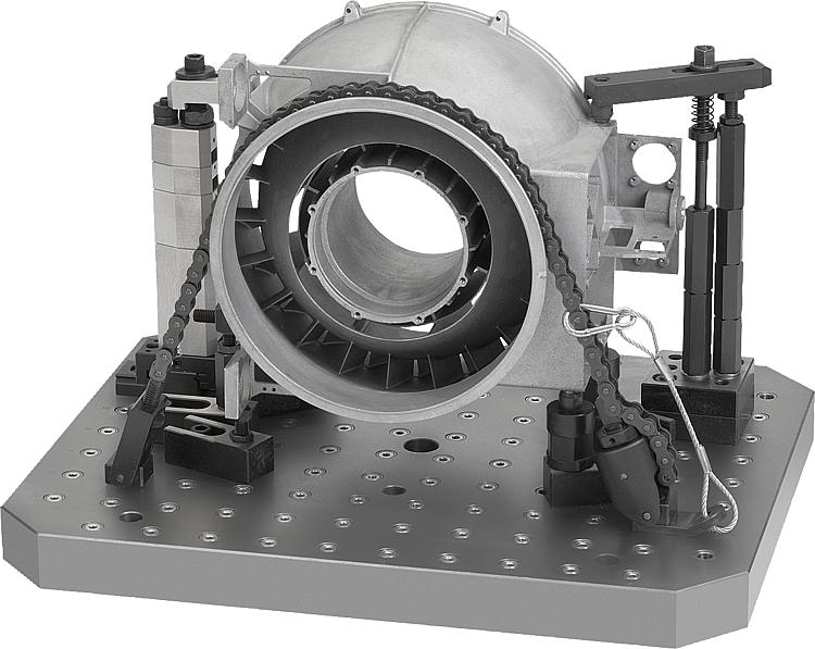 L’utilisation d’éléments en plastique permet de réduire la charge sur la pièce. Utilisation : La longueur de la chaîne et la force de serrage peuvent être préréglées sur la butée à l’aide de l’écrou moleté. Le couple requis se règle sur le crochet de bridage. Accessoires : Chaînes à rouleaux en acier pour kits de tendeurs de chaîne 04211-03.