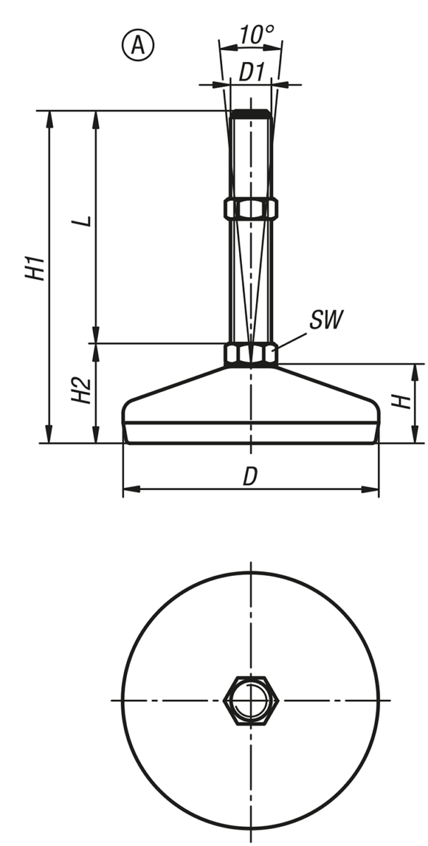 Pieds réglables en acier avec broche filetée pivotante et surface d’appui en caoutchouc. Le revêtement en caoutchouc solide est solidarisé à l’embase en tôle par vulcanisation. Le revêtement en caoutchouc assure une excellente adhérence au sol. Il permet d’amortir les bruits de structure et de réduire la propagation des vibrations et des chocs au sol.